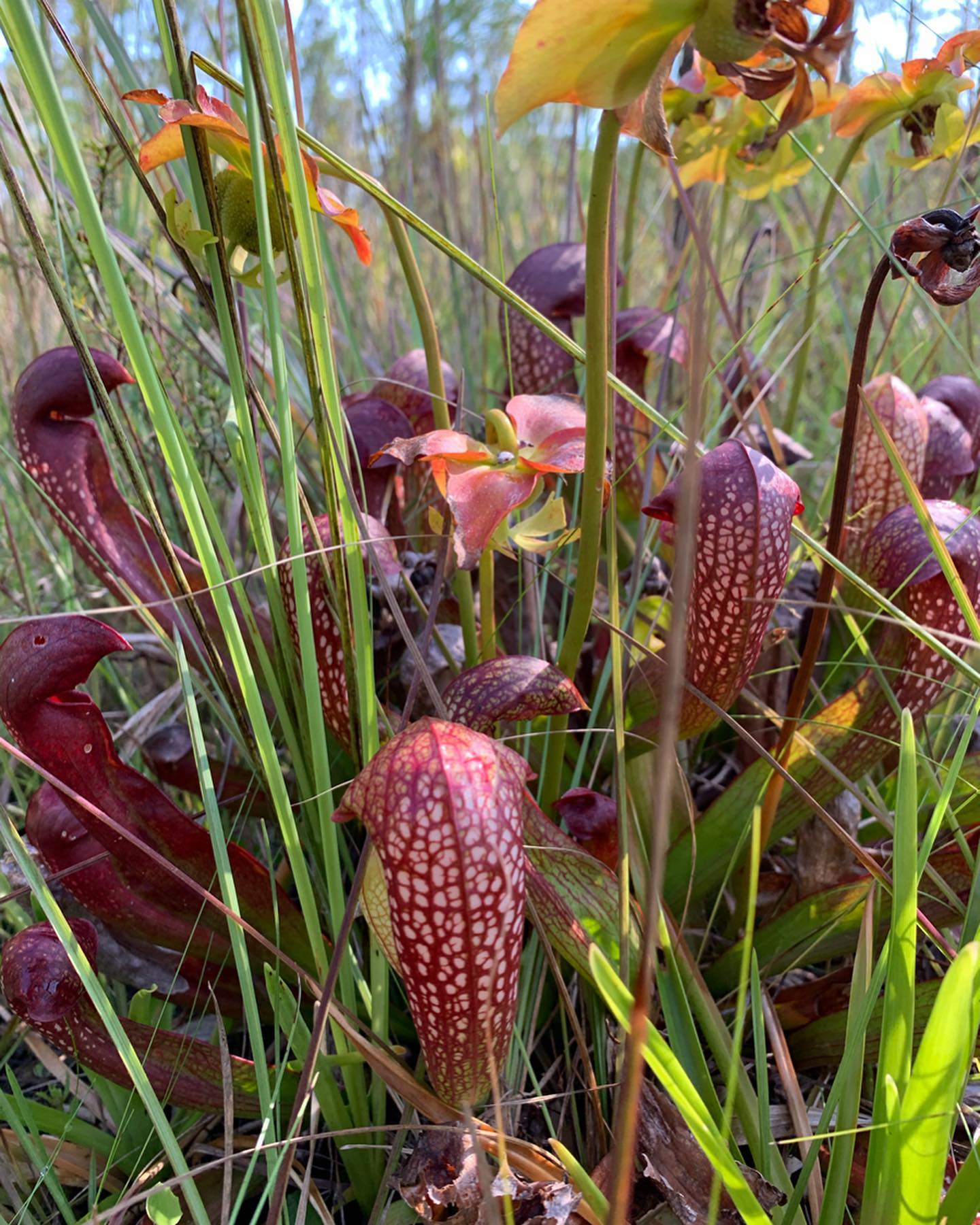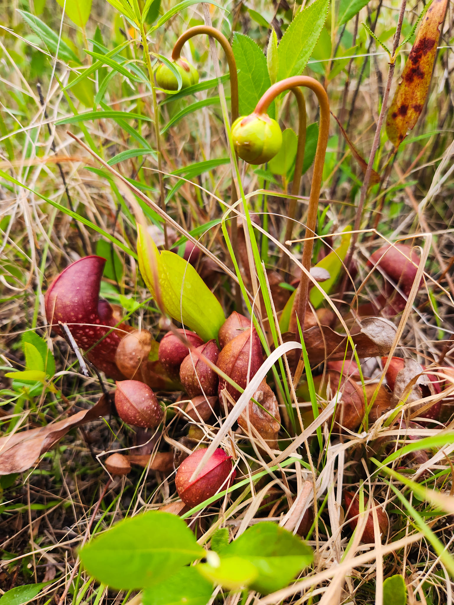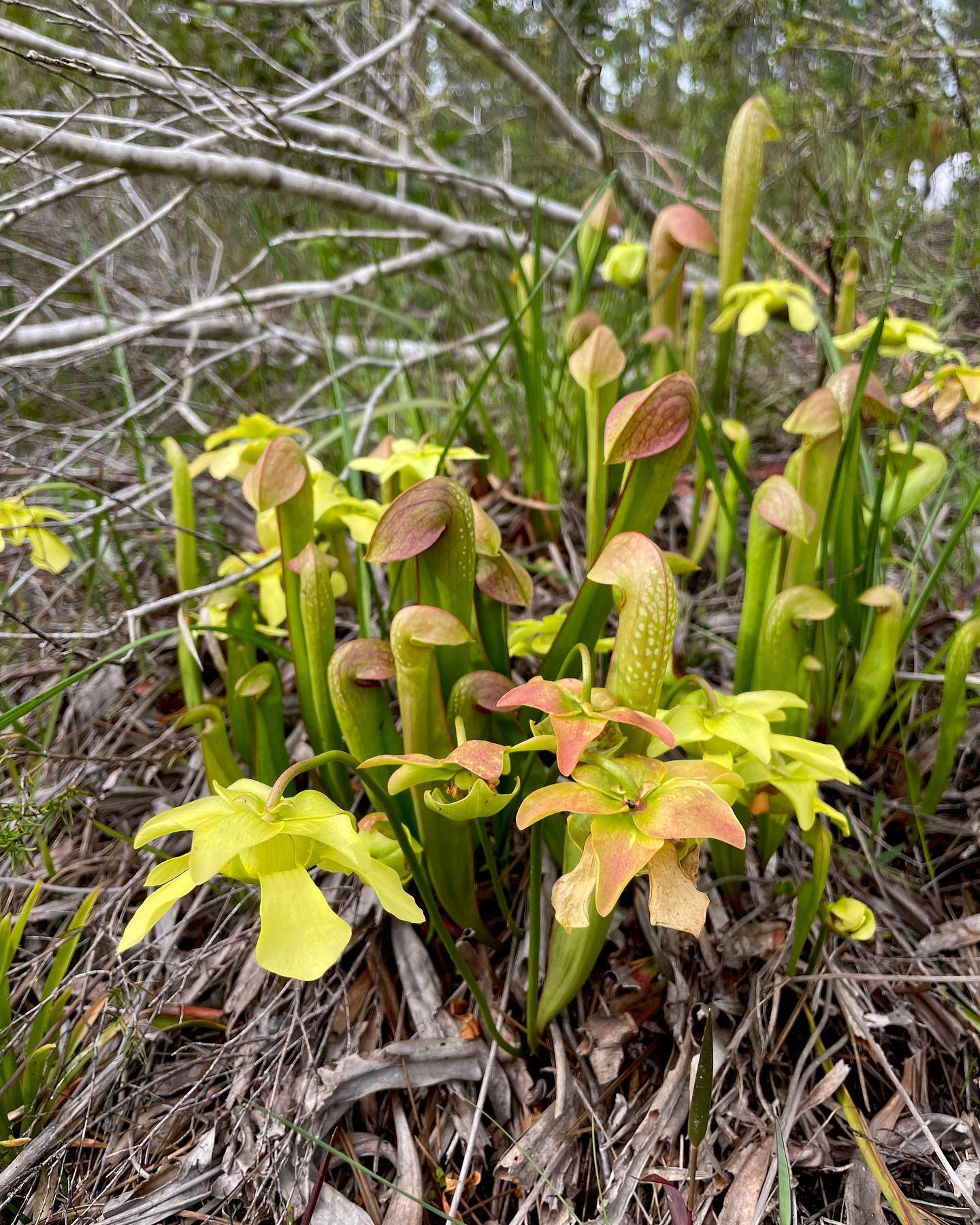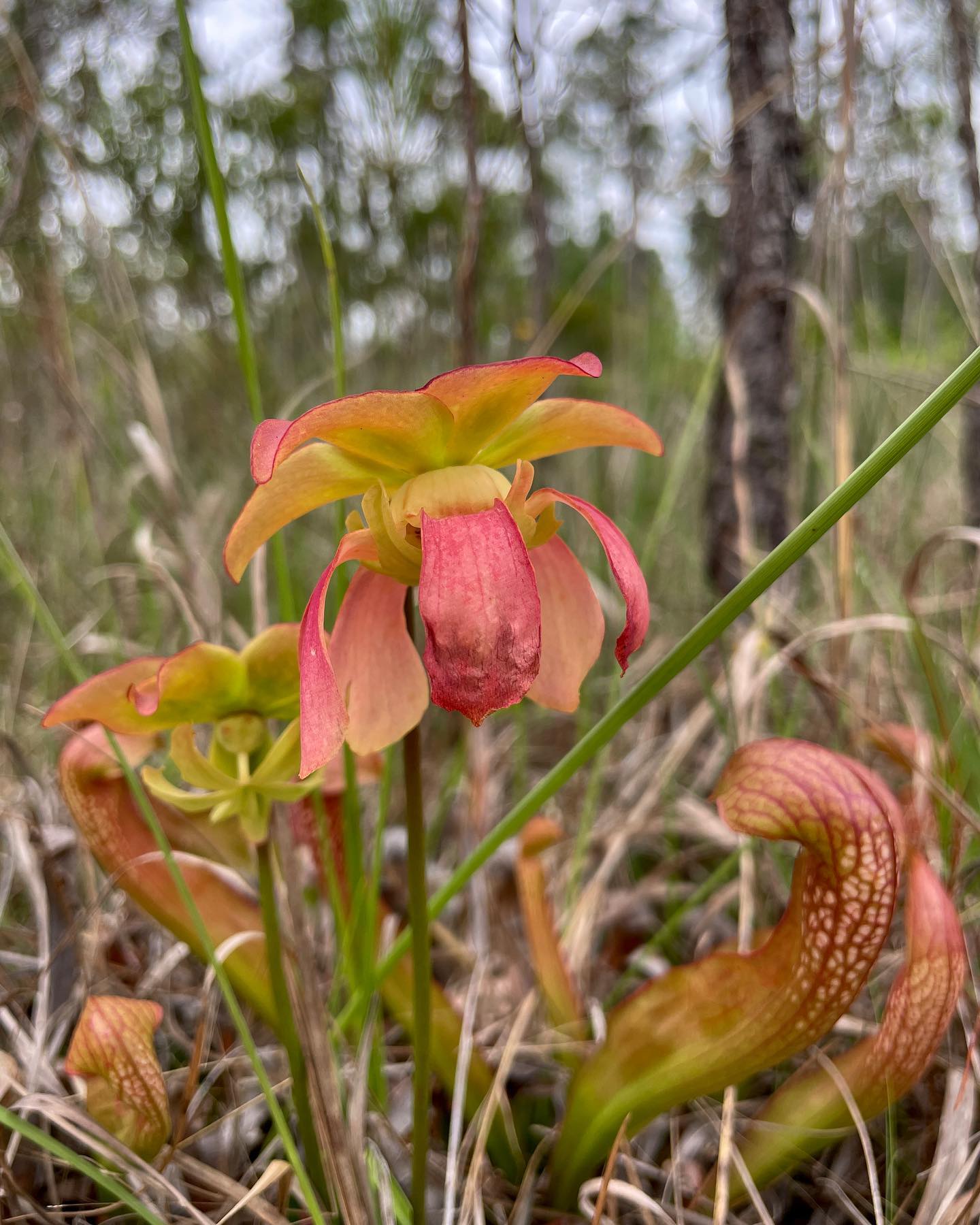 Meet Sarracenia x formosa, the beautiful love child (natural hybrid) of S. minor and S. psittacina. Documented from 4 counties in North Florida. This pitcher plant is a hybrid between Sarracenia minor and Sarracenia pscittacina, known to science as Sarracenia x formosa. Formosa means “beautiful”, which is appropriate for these plants, as they often become a vivid ruby red through the summer. These plants live in the blackwaters of the Okefenokee swamps of Georgia, down near the Florida state line.